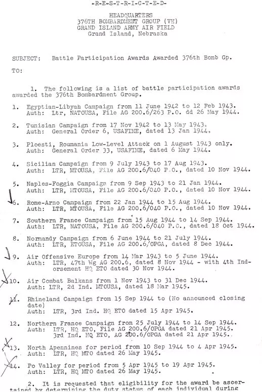 Below is a list of the Battle Participation Awards given to the 376th Bomb Group..
