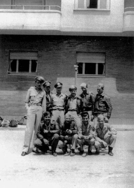 Top row from left to right: Frank Marcus - Pilot, Marshall Peterson - Co-Pilot, Charles MacNally - Navigator, Donald Schoenlein - Bombardier, Charles Gibson - Tail Gunner, George Russell "Bud" Keyes - Waist Gunner.