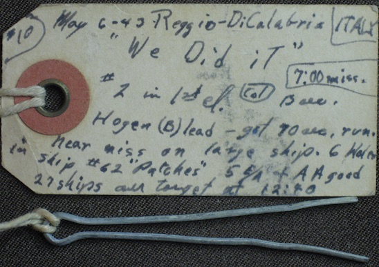 May 6th Reggio D Calabria again, we got a near miss on a large tanker in the harbor. We flew #63 a ship called Patches, we got 6 more holes this trip. 7 hr. mission.