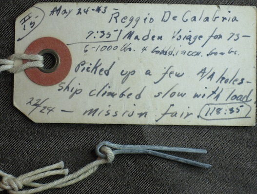 May 24 I flew ship #73, her maiden voyage. We went to Reggio D Calabria with 6-1000 lb. bombs and two boxes of incendiaries. They were about like large dynamite sticks, we opened the box and dumped them out the bottom hatch. Who ever carried them flew last and-low because they scattered like paper and it's not healthy to fly through!